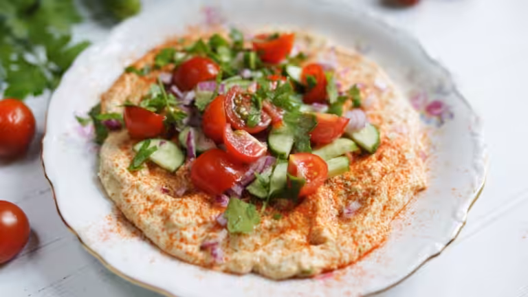 Dieser cremige Hummus wird mit frischen Kräutern, knackigem Gemüse und mediterranem Geschmack zu