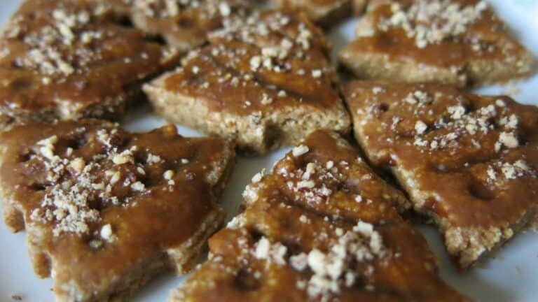 Vermahle 2 EL Kokosblütenzucker (geht sehr gut in einer Kaffeemühle) und rühre den so gewonnenen Puderzucker mit 1 TL Carob und einigen Tropfen Wasser zu einer zähen Glasur an. Abschließend mit dem Pinsel verstreichen und direkt verzieren mit gemahlenen Mandeln, Sesam oder Kokosraspeln.