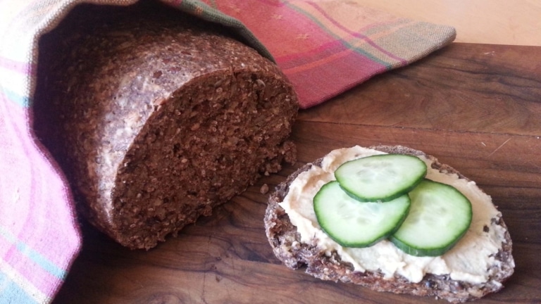 To reduce the fat content, avoid coconut oil and only use e.g. B. 10g sunflower seeds. You can also reduce the chia seeds to 10g, because the highest fat content of this bread recipe is hidden in them and in the seeds. However, you should then add 2 teaspoons of baking powder to the dough. It then needs about an hour to rest and it turns out to be a very fluffy and delicious bread, even without much resting time.