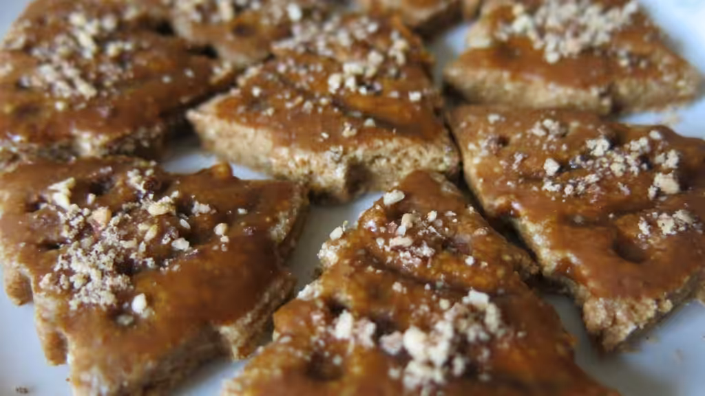 Grind 2 tablespoons of coconut blossom sugar (works very well in a coffee grinder) and mix the resulting powdered sugar with 1 teaspoon of carob and a few drops of water to form a thick glaze. Finally, spread with a brush and decorate directly with ground almonds, sesame or coconut flakes.