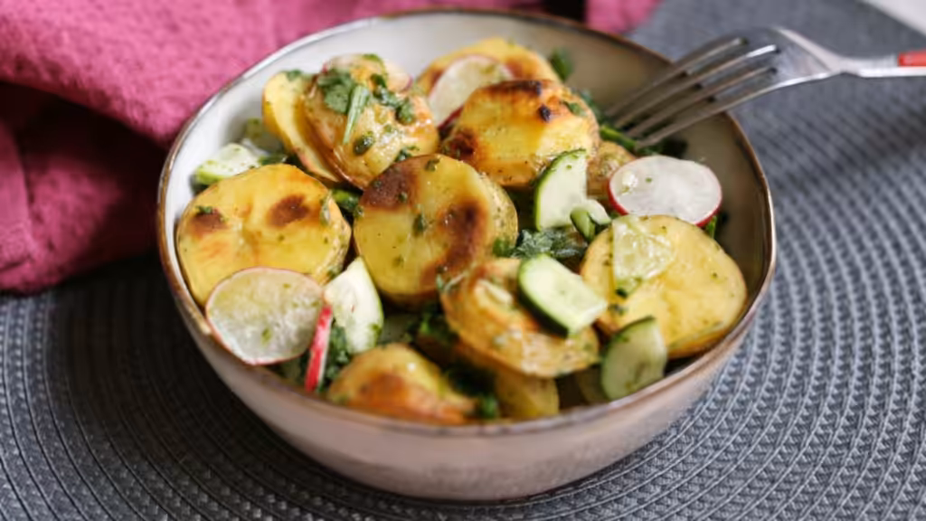- Place potatoes in a large bowl, add radishes, cucumber, spring onions and arugula.