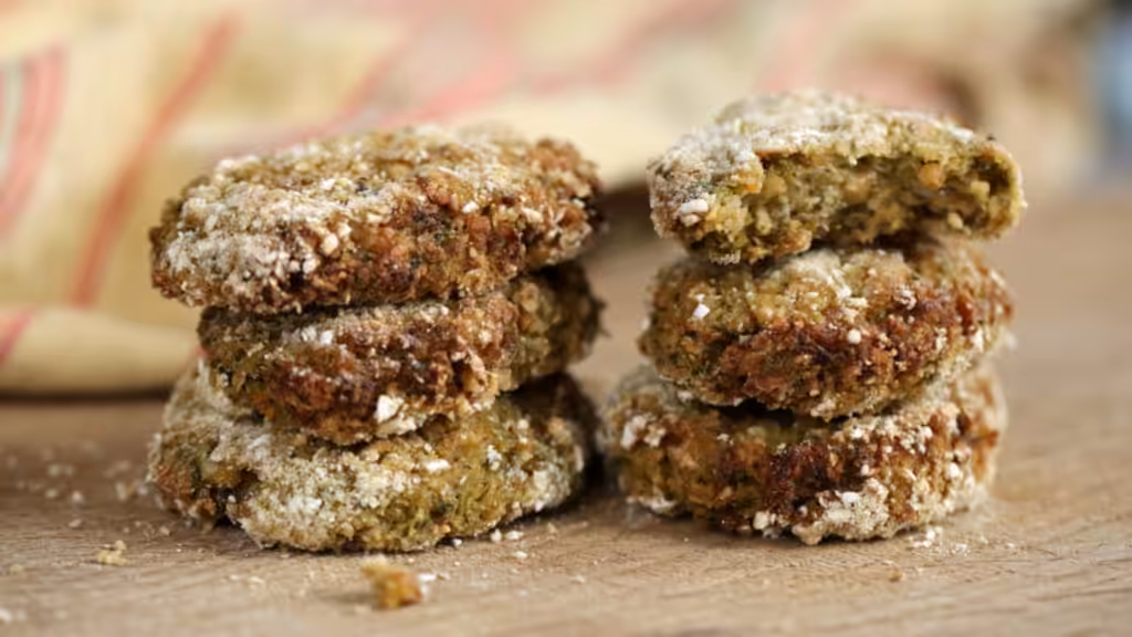 Form 16 nuggets from the mixture. Dip each nugget one at a time into the chickpea water and then into the breading to coat the nuggets on all sides.