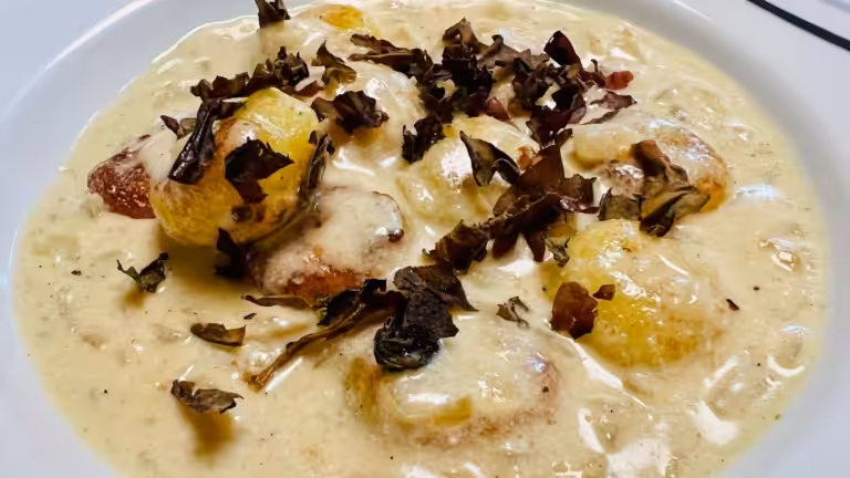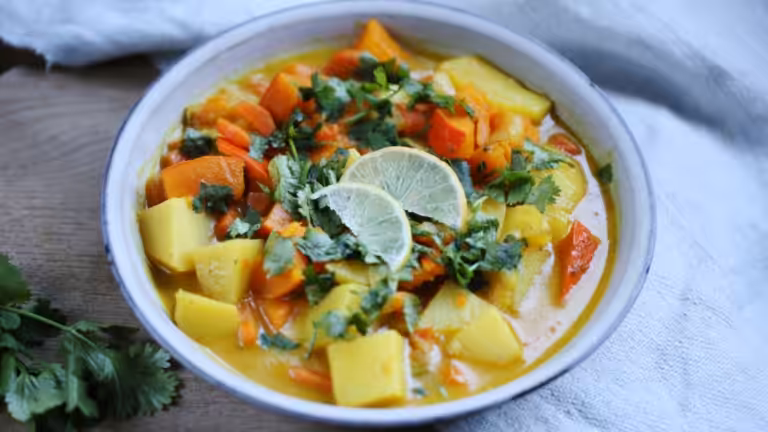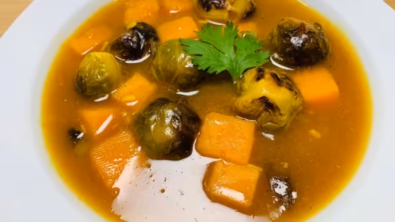 Sopa de patatas ahumadas con brochetas de calabaza y coliflor
