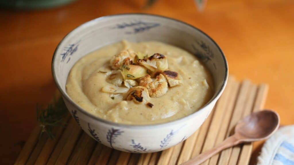 Sopa de patatas ahumadas con brochetas de calabaza y coliflor