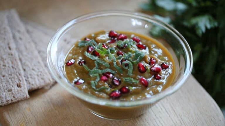 Nach dem Abkühlen der Länge nach aufschneiden und mit einem Löffel das Fruchtfleisch aus der Haut kratzen. In einem Hochleistungsmixer mit den anderen Zutaten (außer Granatapfelkernen, Petersilie und Minze) ca. 1 Minute mixen, bis eine dicke, cremige Konsistenz erreicht ist.