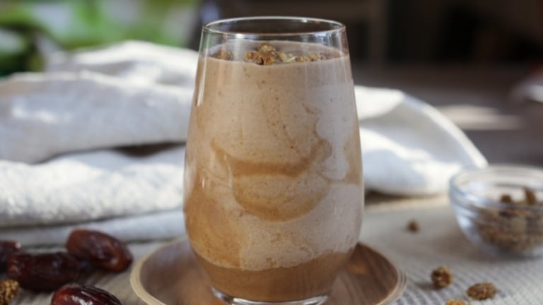 Pour le shake, mixez les bananes, le liquide sélectionné, la poudre de chaga et les dattes dans le mixeur pour former un shake crémeux.