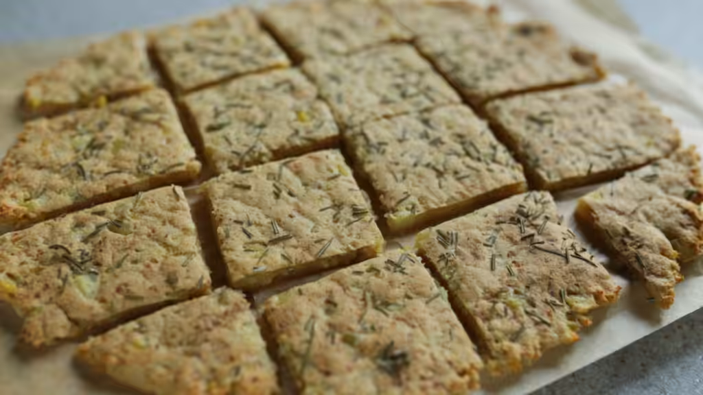 Sur une plaque à pâtisserie recouverte de papier sulfurisé, étalez la pâte en un pain plat d’environ 1 cm d’épaisseur en veillant à ce qu’elle ne soit pas trop épaisse au milieu. Étalez le romarin sur la pâte et pressez-le légèrement. (Au lieu du romarin, vous pouvez également utiliser d’autres herbes comme la sauge, le persil, l’origan ou le thym.)