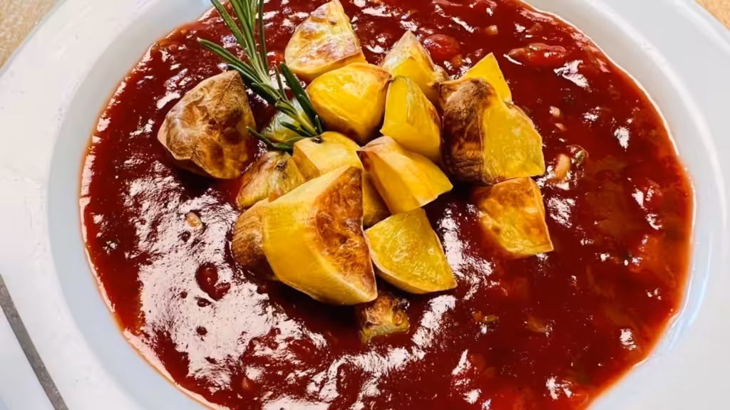 Servir le tout dans des assiettes creuses, en plaçant les morceaux de pommes de terre dorés au four au milieu du sugo.