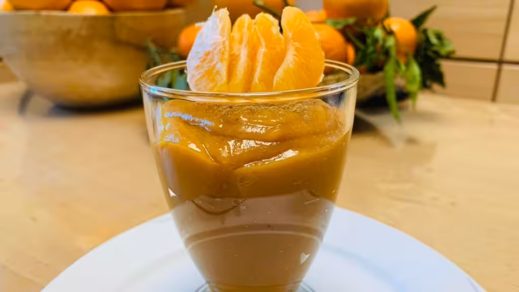 Das gesamte Obst in einen kräftigen Blender geben und etwa 1 Minute gründlich mixen. Anschließend die restlichen Zutaten (mit Ausnahme der Mandarinen) hinzugeben und alles mehrere Minuten zu einer cremigen Masse mixen.