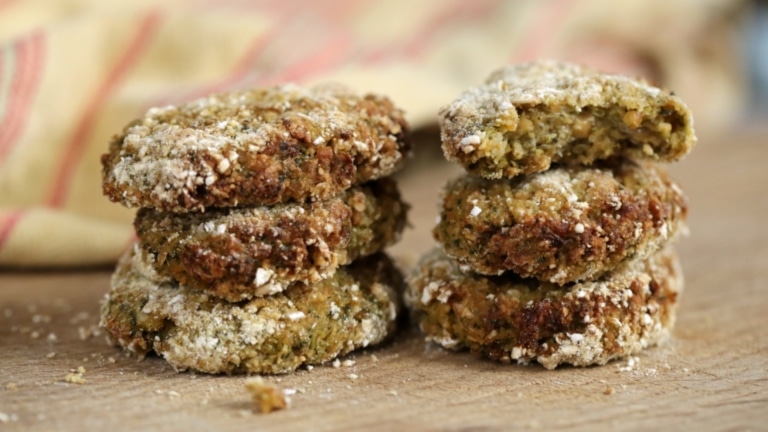 Formare 16 crocchette dal composto. Immergere ciascuna crocchetta alla volta nell’acqua dei ceci e poi nella panatura in modo da ricoprirla su tutti i lati.
