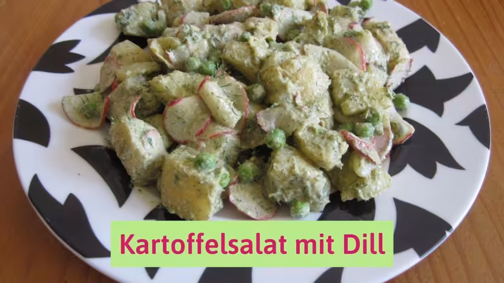 Tagliare le patate raffreddate una volta. Se vengono utilizzate patate grandi, tagliarle a cubetti. Mescolare in una ciotola le fettine di ravanello, i piselli, l’aneto e il sale.