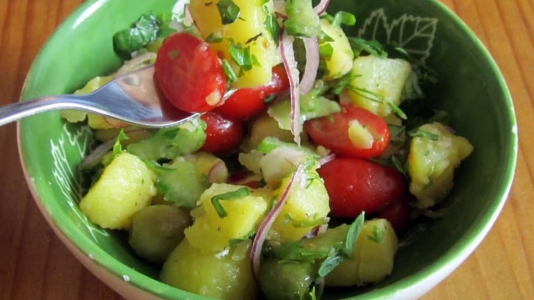 Un’insalata di patate leggera e rinfrescante, particolarmente buona fresca nelle giornate calde. Delizioso anche per un picnic mentre si nuota.