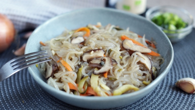 Mentre i noodles cuociono, scalda una padella capiente a fuoco medio-alto e aggiungi la cipolla e i funghi shiitake. Mescolare di tanto in tanto e cuocere fino a quando le cipolle e i funghi shiitake saranno morbidi e dorati, 5–8 minuti. Se necessario aggiungete un po’ d’acqua per evitare che brucino.