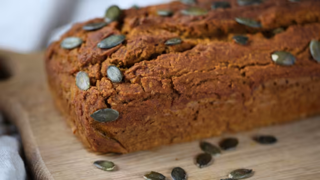 Versare gli ingredienti umidi in quelli secchi. Mescolare fino a quando tutto sarà omogeneo. L’impasto è ideale quando è denso ma colabile. Versare l’impasto nella teglia preparata e cospargere con semi di zucca (se lo si desidera). Cuocete ora per 50–60 minuti, finché la superficie non sarà dorata e con lo stuzzicadenti utilizzato per testare l’impasto non saranno rimasti residui appiccicosi.