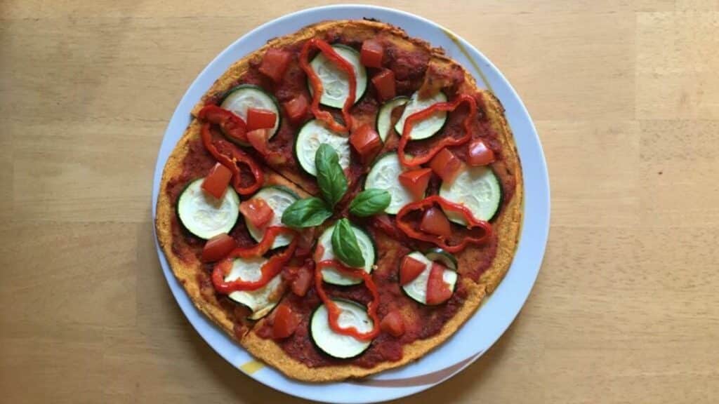 Foderare una teglia con carta da forno e modellare l’impasto di patate dolci in una pizza rotonda. Cuocete in forno per circa 20–25 minuti, a seconda di quanto volete che sia croccante la crosta.