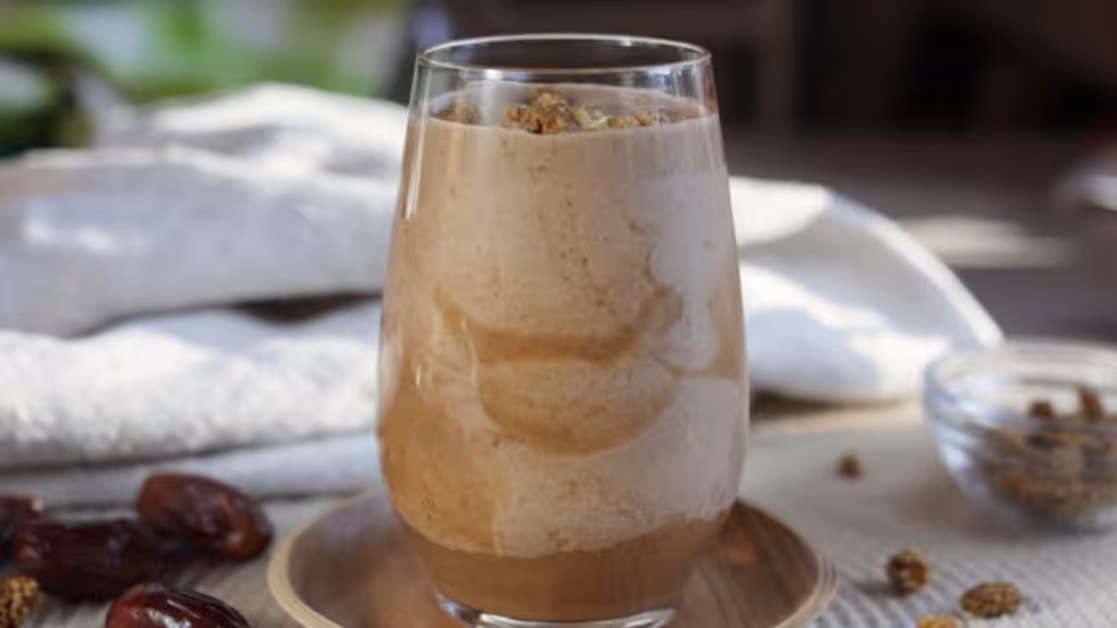 Einige Esslöffel der Dattelsoße in einem Glas verteilen und den Shake darüber gießen. Eventuell mit getrockneten Maulbeeren garnieren und sofort servieren.