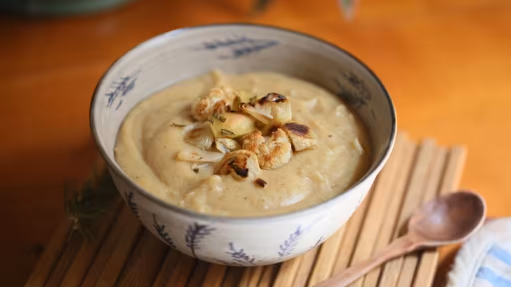 Die Suppe entweder mit einem Stabmixer oder in einem Standmixer (in Portionen) glatt pürieren. Etwas mehr Heilbrühe oder Mandelmilch hinzufügen, wenn eine dünnere Konsistenz gewünscht wird.