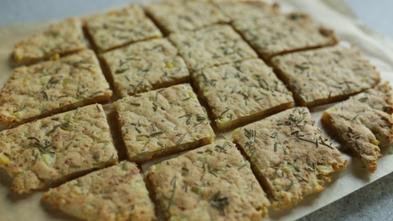 Auf einem mit Backpapier ausgelegten Backblech den Teig zu einem Fladenbrot von gut 1 cm Dicke auswalzen und darauf achten, dass er in der Mitte nicht zu dick wird. Den Rosmarin auf dem Teig verteilen und leicht andrücken. (Statt Rosmarin kann man auch andere Kräuter wie Salbei, Petersilie, Oregano oder Thymian verwenden.)