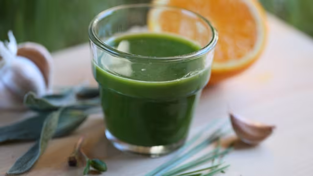 - 1/4 Tasse fest gepacktes Weizengras (oder 2 Teelöffel aufgetauter gefrorener Weizengrassaft)