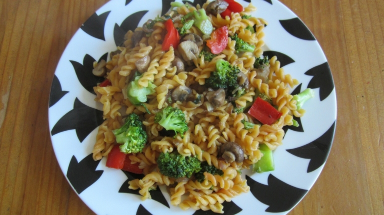 Het gerecht smaakt ook net zo lekker met kikkererwtennoedels of groene erwtennoedels