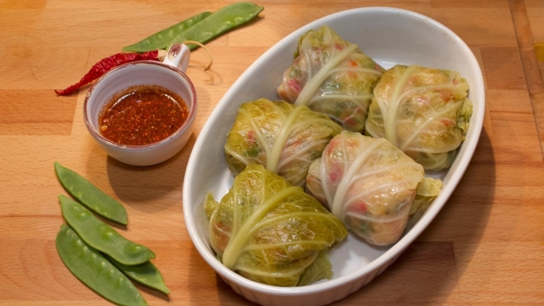 Bestrijk elk koolblad met ca. 60 g vulling vanaf de onderkant van de stengel. Vouw de zijkanten van het vel over elkaar heen en rol het strak op. Stoom met de gevouwen kant naar beneden in de stoompan gedurende ca. 10–12 minuten tot alles gaar is.
