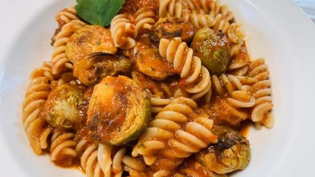 Voeg ondertussen ahornsiroop, zout, limoen en citroensap toe en breng opnieuw goed op smaak. Doe de spruitjes aan het einde van de baktijd in een kom en breng op smaak met 1 – 2 extra snufjes zout. Meng goed en voeg toe aan de pot met de gepureerde saus. Meng porties met de pasta in een kom en serveer onmiddellijk.