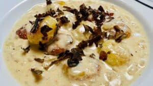 Das Ragout nochmals mit Salz und Pfeffer abschmecken und mit den frisch gegrillten, knusprigen Kartoffeltalern oben aufliegend heiß servieren.