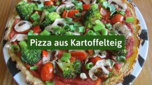 Ein Backblech mit Backpapier auslegen und den Süßkartoffelteig zu einer runden Pizza formen. Ca. 20–25 Minuten im Ofen backen, je nachdem wie kross die Kruste sein soll.
