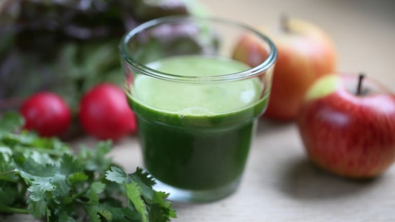Apfelsaft-Eis am Stiel auf Holzbrett mit Apfel