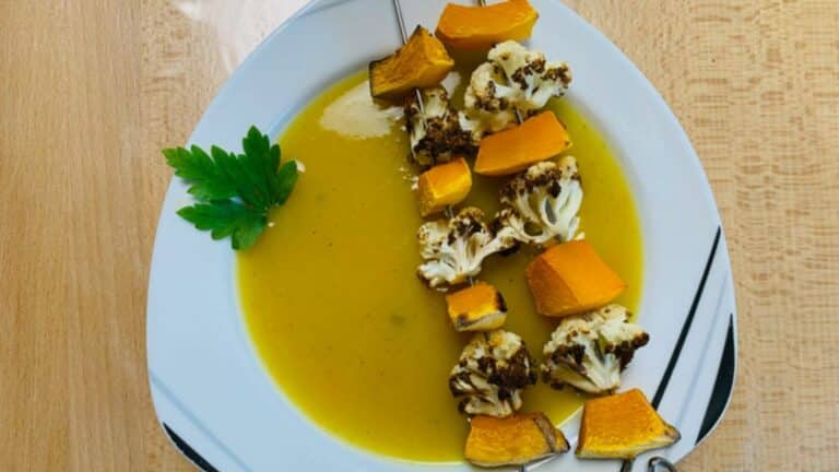 Gerauch­te Kar­tof­fel­sup­pe mit Kürbis-Blumenkohlspießen