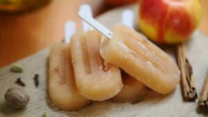 Apfelsaft-Eis am Stiel auf Holzbrett mit Apfel